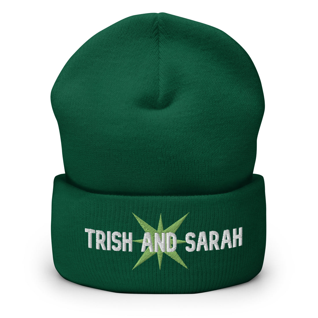 Snug and form-fitting green beanie with embroidered Trish and Sarah star logo and text. One...