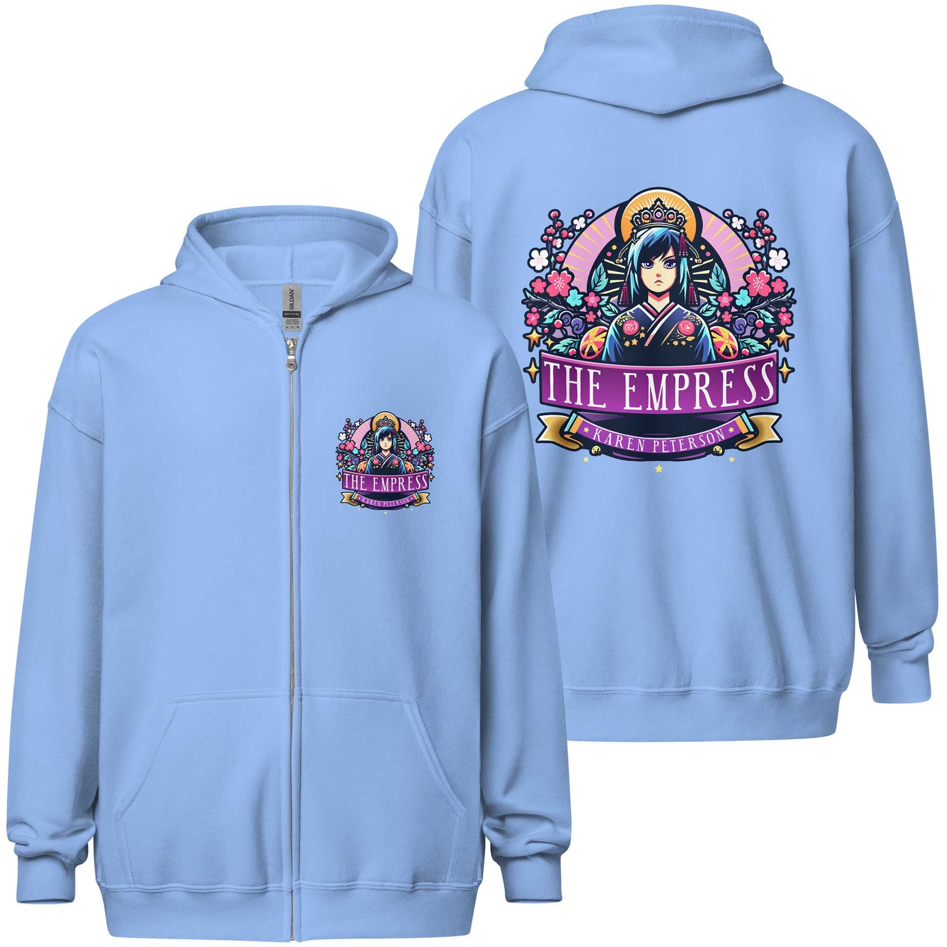 Classic heavy blend zip hoodie with Karen Peterson's 'The Empress' artwork printed on the front left chest and back