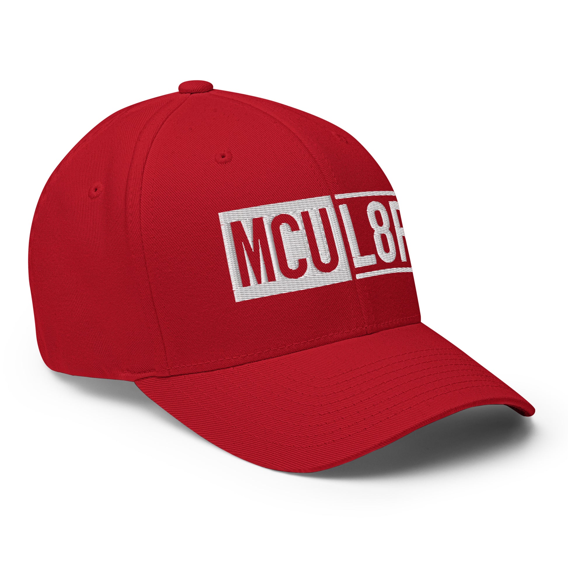 6-Panel medium profile sloped crown red Flexfit cap with embroidered MCU L8R logo.