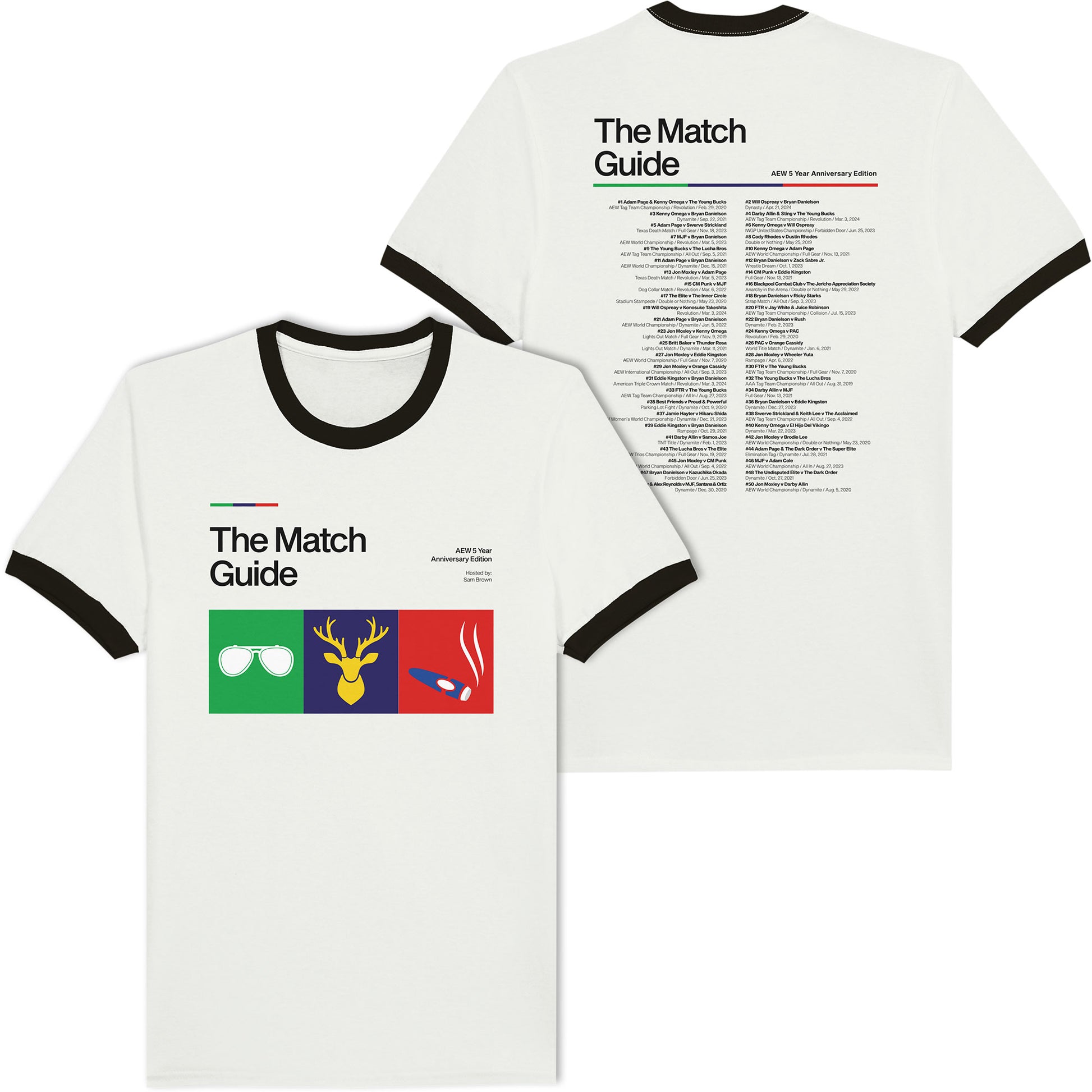 Premium white ringer tee with black trim featuring The Match Guide (AEW 5 Year Anniversary Edition) artwork on the front and the top 50 matches from AEW's 5 year history on the back