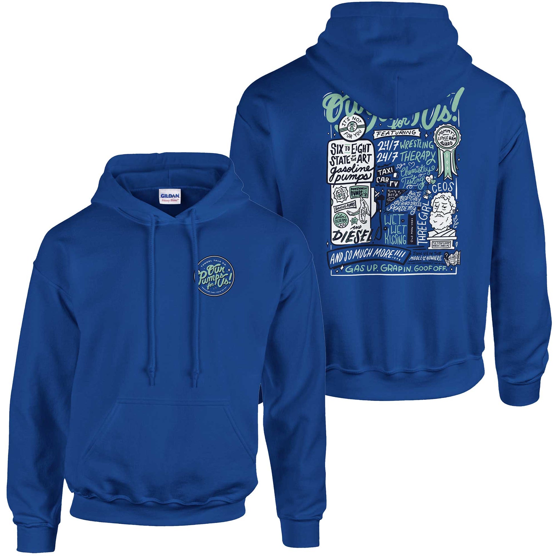 Pullover hoodie with Tunnel Talk's Our Pumps For Us! logo of the left chest and artwork on the back