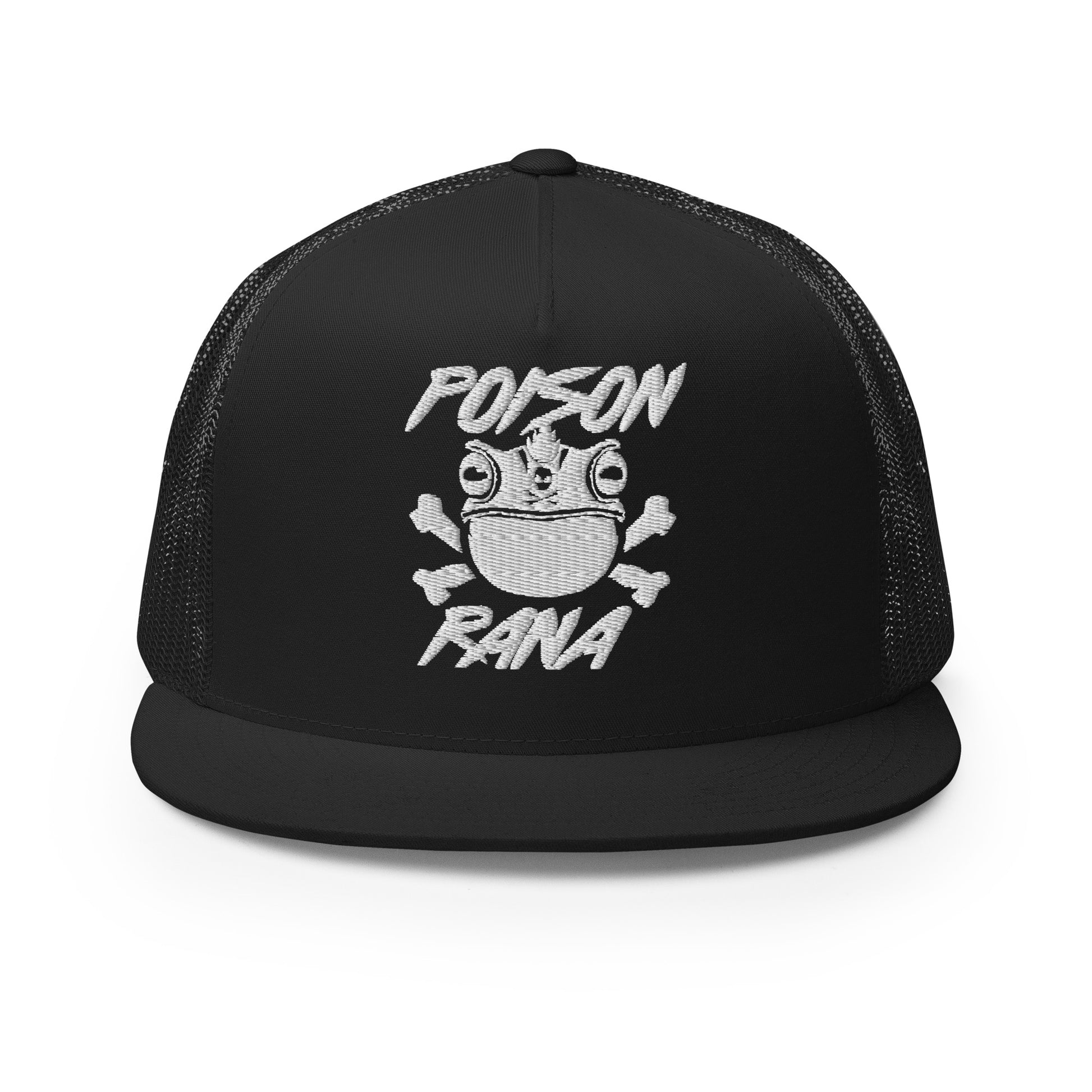 5-Panel high profile flat brim snapback trucker cap with embroidered alternative Poisonrana logo. One size fits all