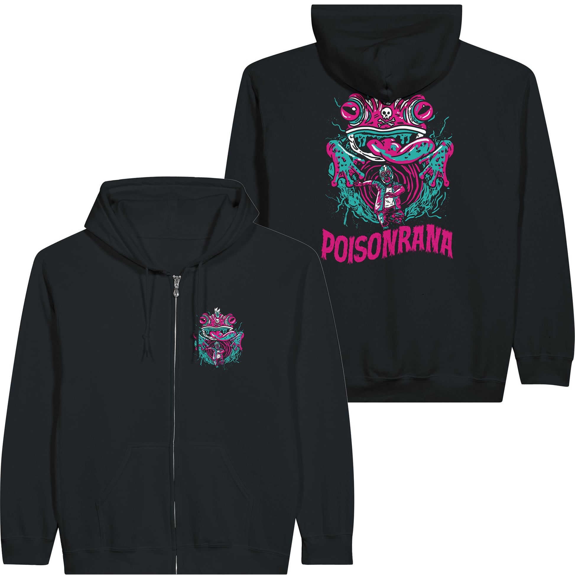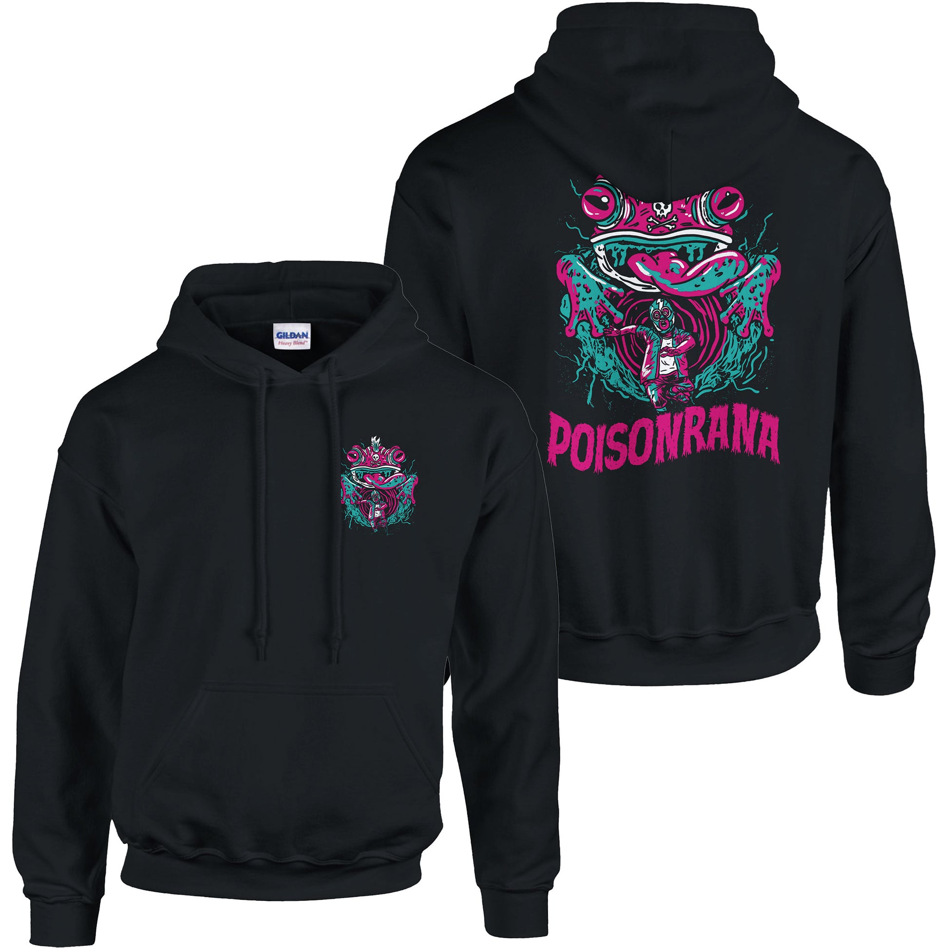 Poisonrana's Lucha Frog of Doom printed on the front & back of various hoodies