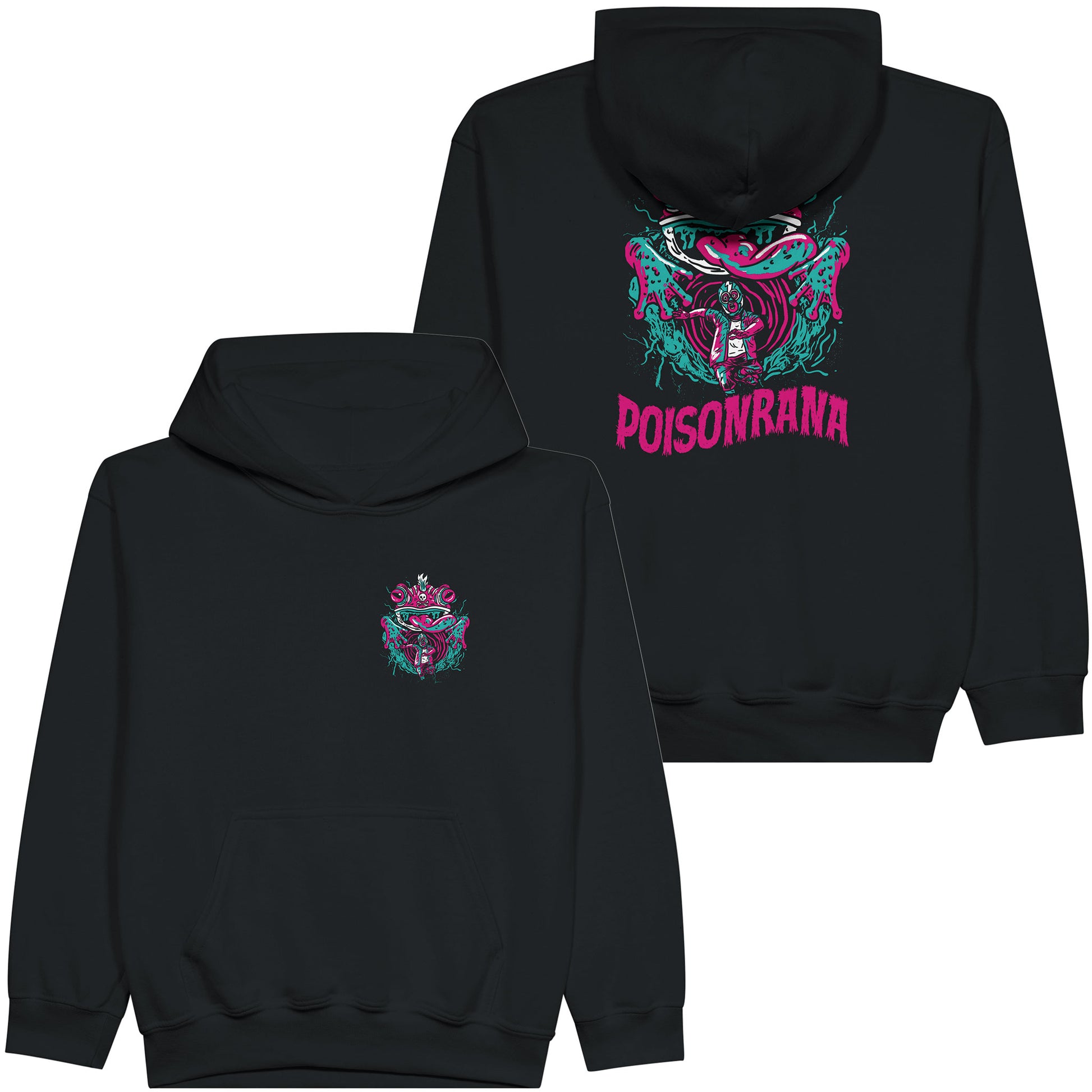 Poisonrana's Lucha Frog of Doom printed on the front & back of a kids sized black pullover hoodie