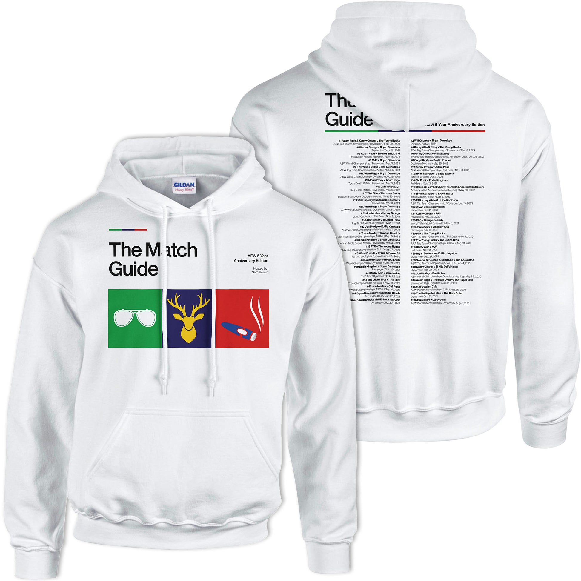 Classic heavy blend white pullover hoodie featuring The Match Guide (AEW 5 Year Anniversary Edition) artwork on the front and the top 50 matches from AEW's 5 year history on the back