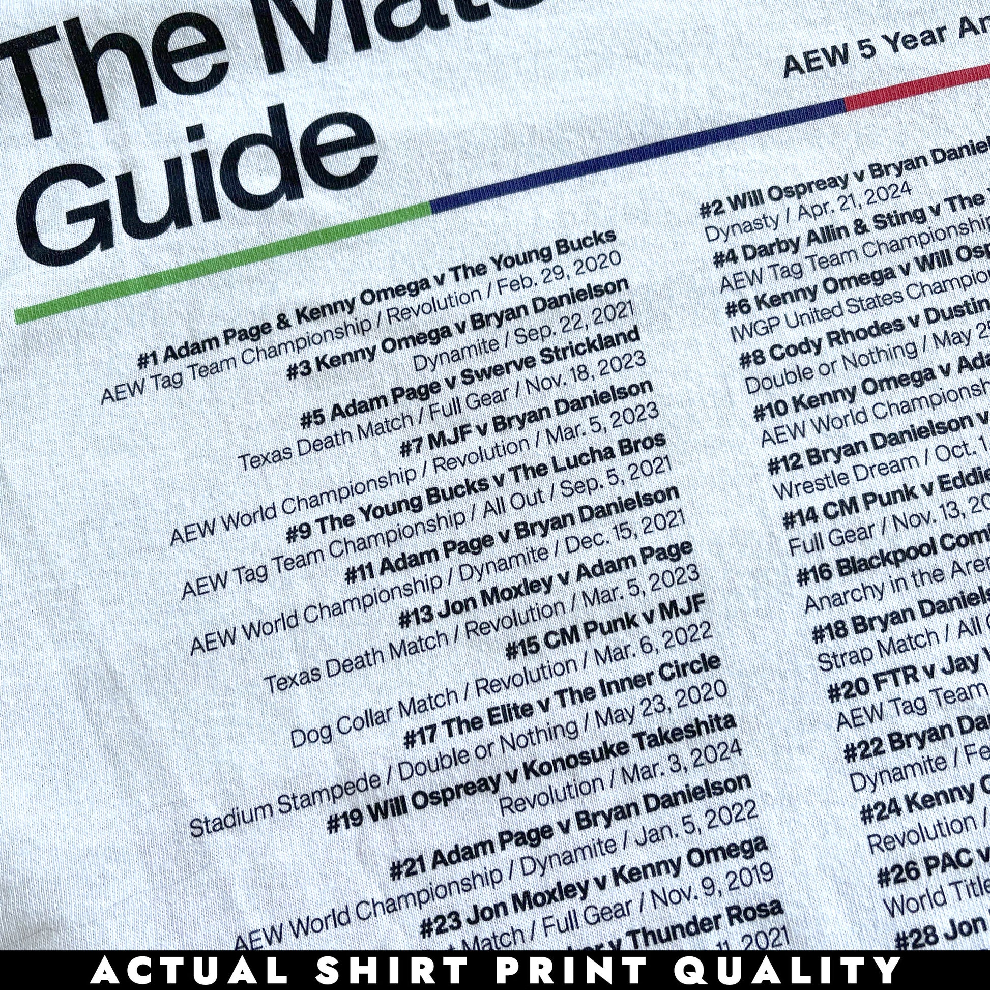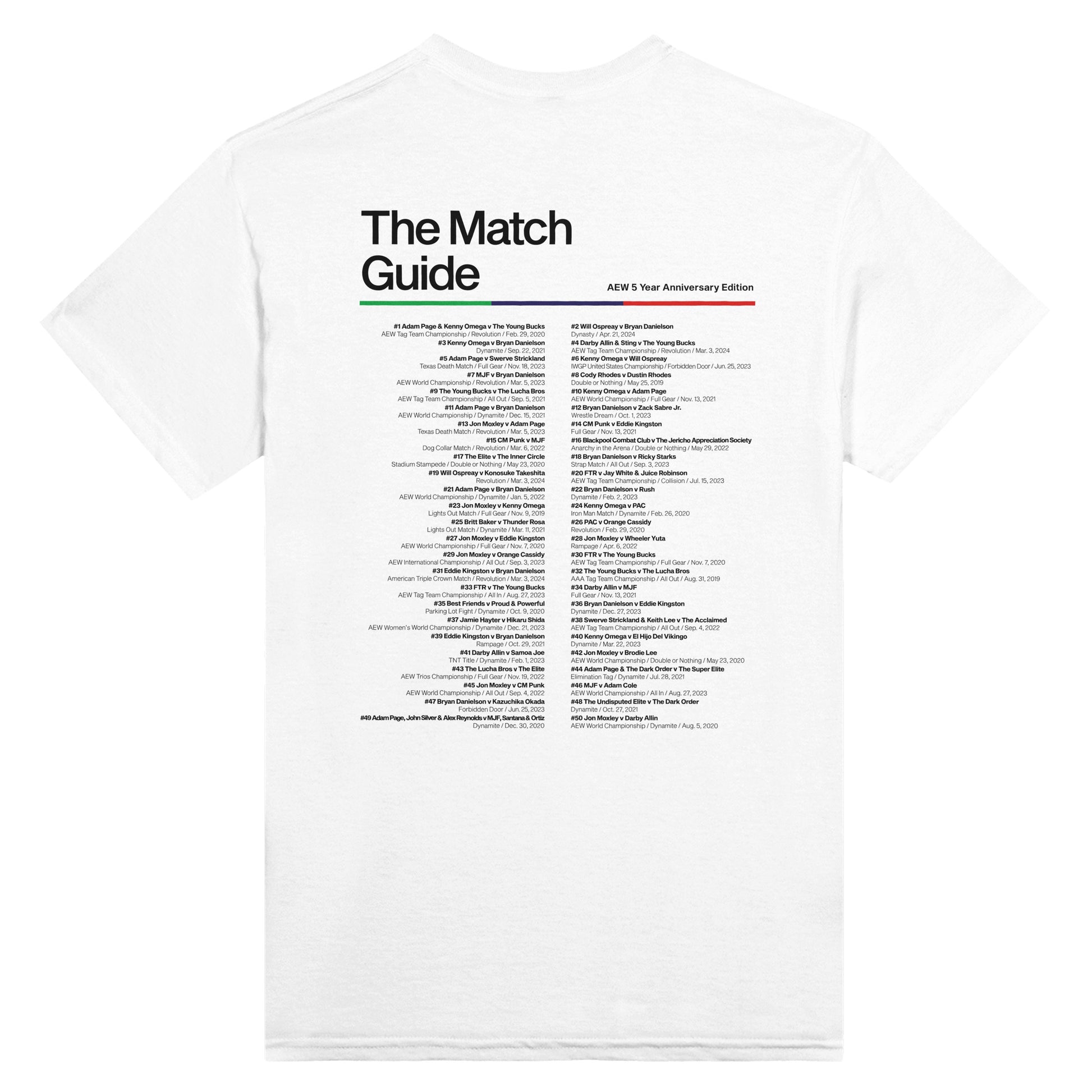 Classic white tee featuring The Match Guide (AEW 5 Year Anniversary Edition) artwork on the front and the top 50 matches from AEW's 5 year history on the back