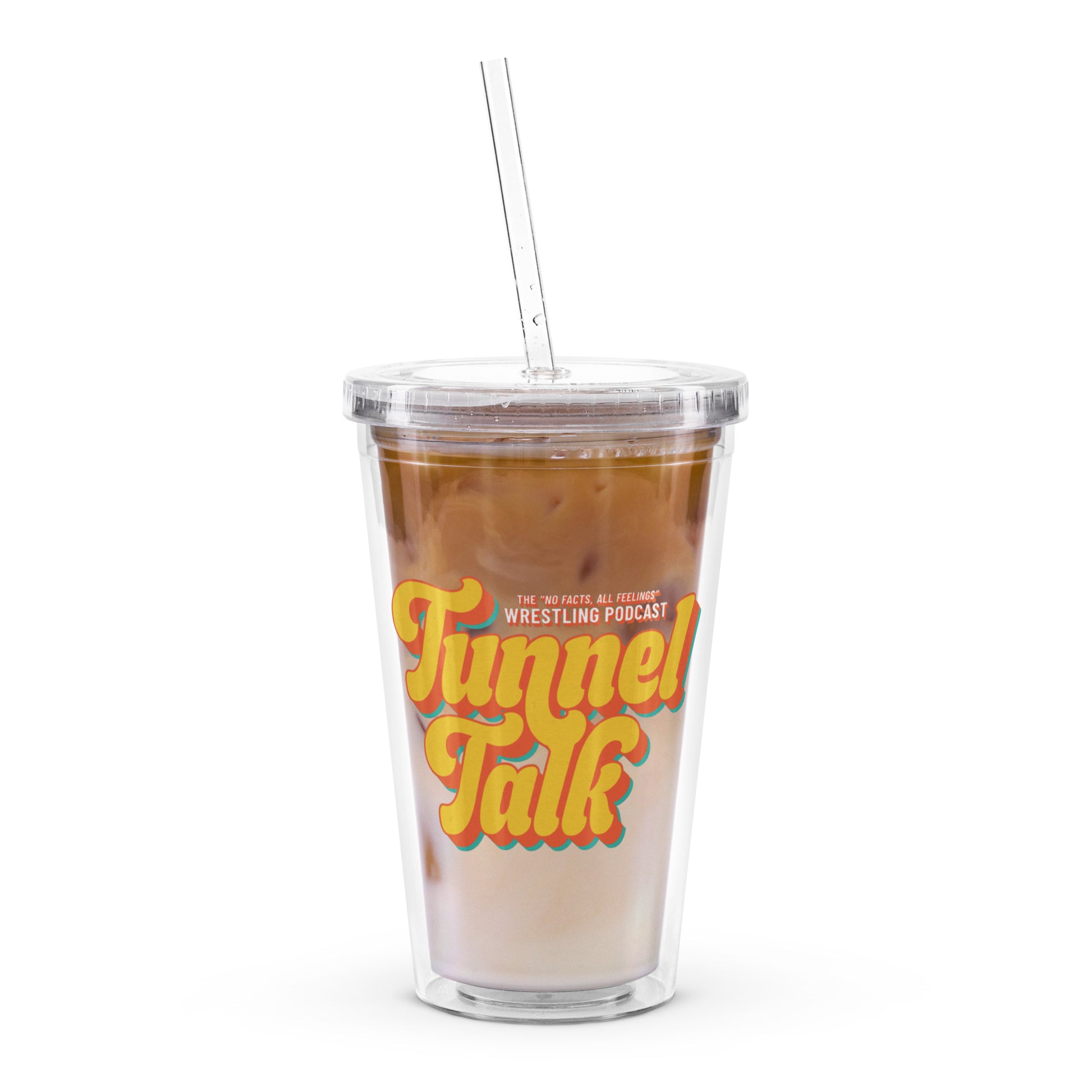 16oz (590ml) clear acrylic plastic double wall insulated tumbler and straw featuring Tunnel Talk logo